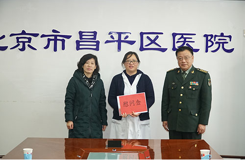 1月29日下午,昌平区区委常委、武装部部长陈军和区民政局副局长刘卫华在区卫生计生委党委副书记、副主任石彩红,党委委员、副主任左晨的陪同下来到昌平区医院慰问消化内科医生、军属郝志玲同志,送上慰问金和节日的祝福。