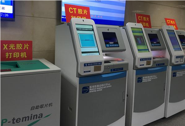 7台自助胶片打印机位于医院门诊2楼大厅,外形类似银行自助取款机,患者只要将取片条形码放置在扫描处一扫,机器便会“吐”出放射胶片和报告。 打印出来的报告用醒目的字体标明患者的姓名、编号和检查日期,便于患者查看核对。自助胶片打印机24小时开机,患者可随时取走检查的报告及胶片,大大方便了患者就医流程。