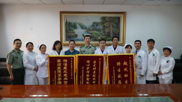 5月22日上午,国防大学学生处廖处长带队一行四人来到昌平区医院,代表学校对医院参与抢救的全体医护人员表示衷心感谢,并向急诊科、心内二科和骨二科送上锦旗。