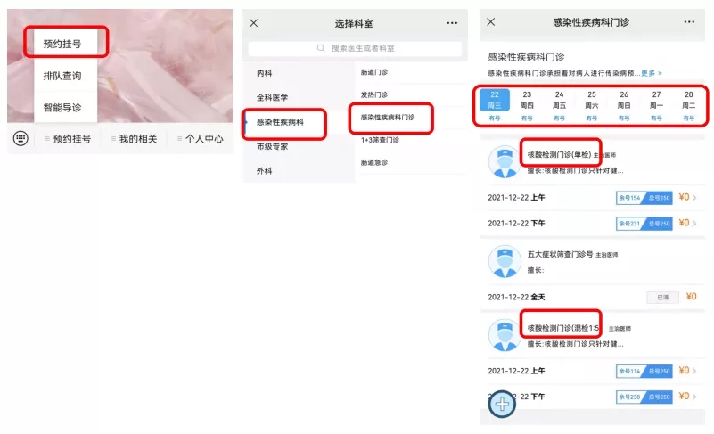 1.关注“北京市昌平区医院”微信公众号。点击预约挂号→感染性疾病科→感染性疾病科门诊→选择日期、预约号源(单检、混检均可)