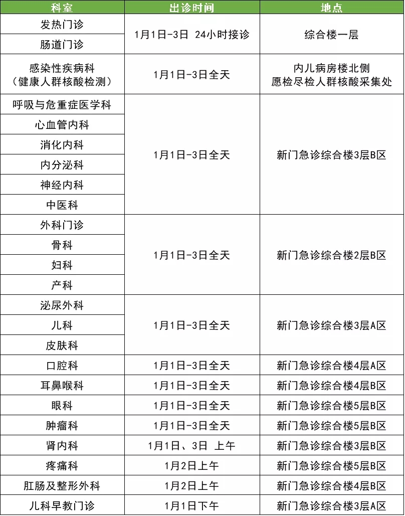 为保证2022年“元旦”放假期间患者的就医需求,昌平区医院各科室出诊安排如下,请您预约就诊(发热门诊、肠道门诊除外)。