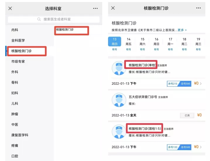 关注“北京市昌平区医院”微信公众号。点击“预约挂号”,选择左侧“核酸检测门诊”→“核酸检测门诊”→选择日期、上午/下午、单检/混检→选择下方时间段→“确认”→“立即预约”。