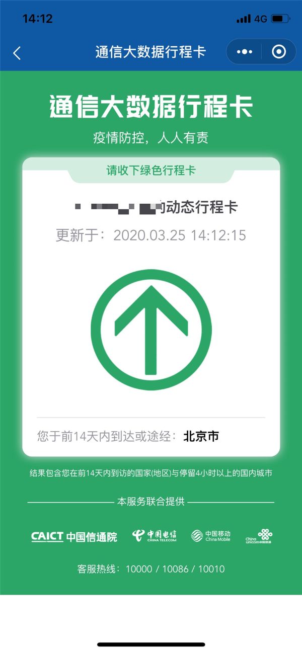“疫情防控行程卡”是由国务院客户端发布的小程序,支持一键查询14天内该人员在国内城市(驻留超过4小时)以及境外到访地行程。