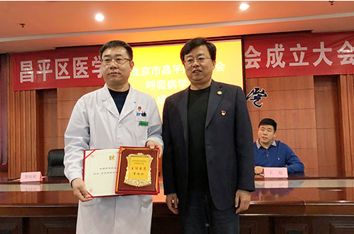 昌平区医学会会长胡光向主任委员李向欣颁发证书,肯定了昌平区呼吸学界医务工作者对辖区公众健康所做出的贡献,明确了呼吸病学分会成立的意义和作用,同时希望分会各位委员和全体会员一如既往地为全区人民健康贡献力量。