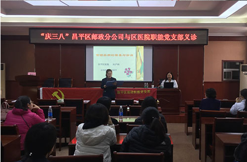 发挥专业优势 关爱女性健康。昌平区医院高度重视女性健康,主动承担社会责任,同过内外并举的形式开展了庆“三八”送健康义诊活动。3月8日上午在门诊楼一层组织妇科、产科、营养科等科室专家开展了“关爱女性 促进健康”的义诊咨询活动,共为260位女性提供了妇女保健、围产期保健、孕期饮食营养管理等内容的现场咨询、测血压等服务。当日下午组织泌尿外科、骨科、营养科、妇产科等科室专家深入友邻单位--昌平区邮政局,开展了主题为“服务下基层 健康促和谐”义诊活动,为民政局干部职工,特别是女职工提供了健康讲座、免费测血压、血糖及义诊服务。